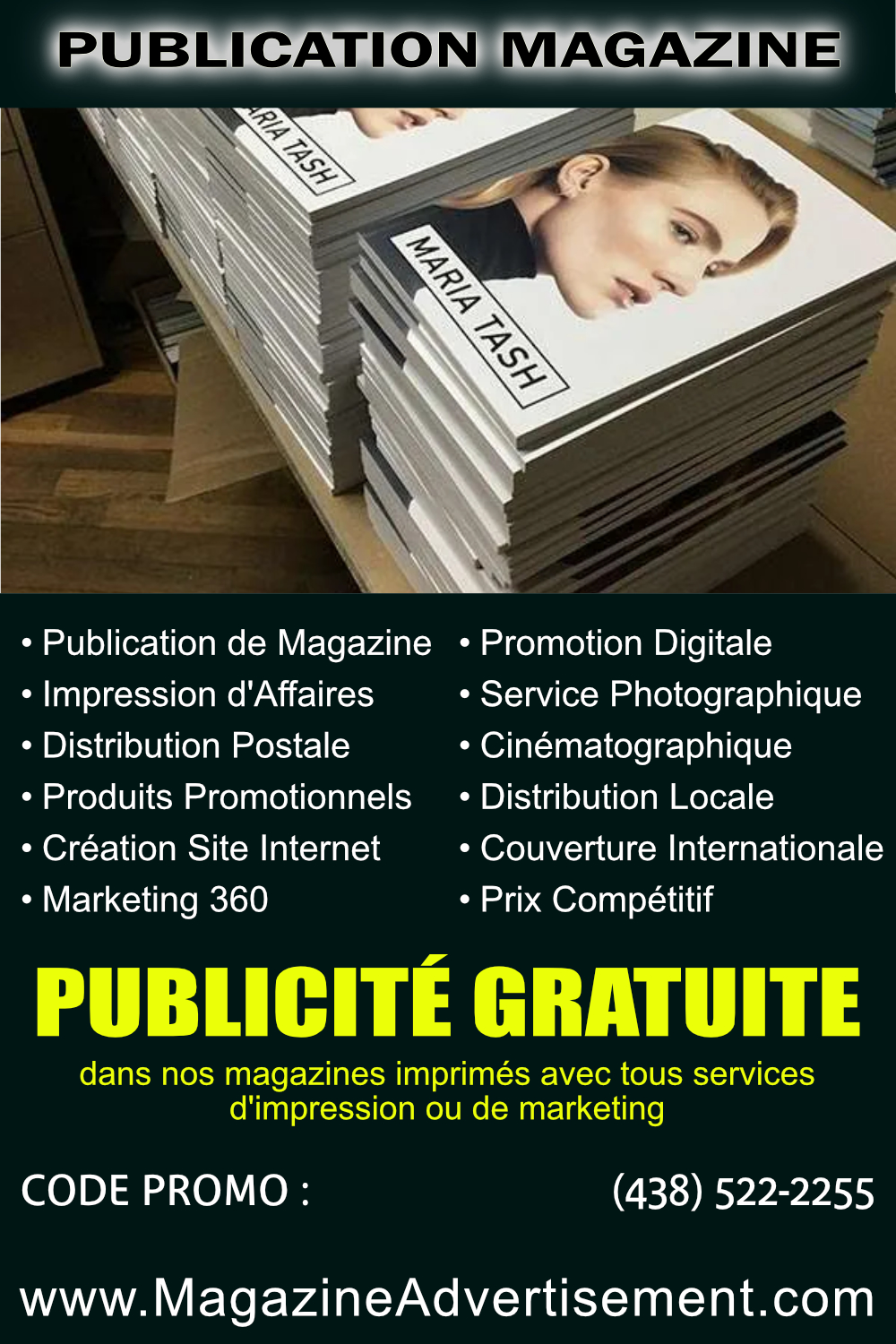 NOTE : Ajoutez votre code promo NOTE : Ajoutez les photos -------------------------------- PUBLICITÉ GRATUITE DANS MAGAZINE. Augmentez votre visibilité maintenant. Envoyez-moi un message privé pour bénéficier de cette offre à durée limitée. www.MagazineAdvertisement.com Pour votre publicité gratuite utiliser le Code Promo :