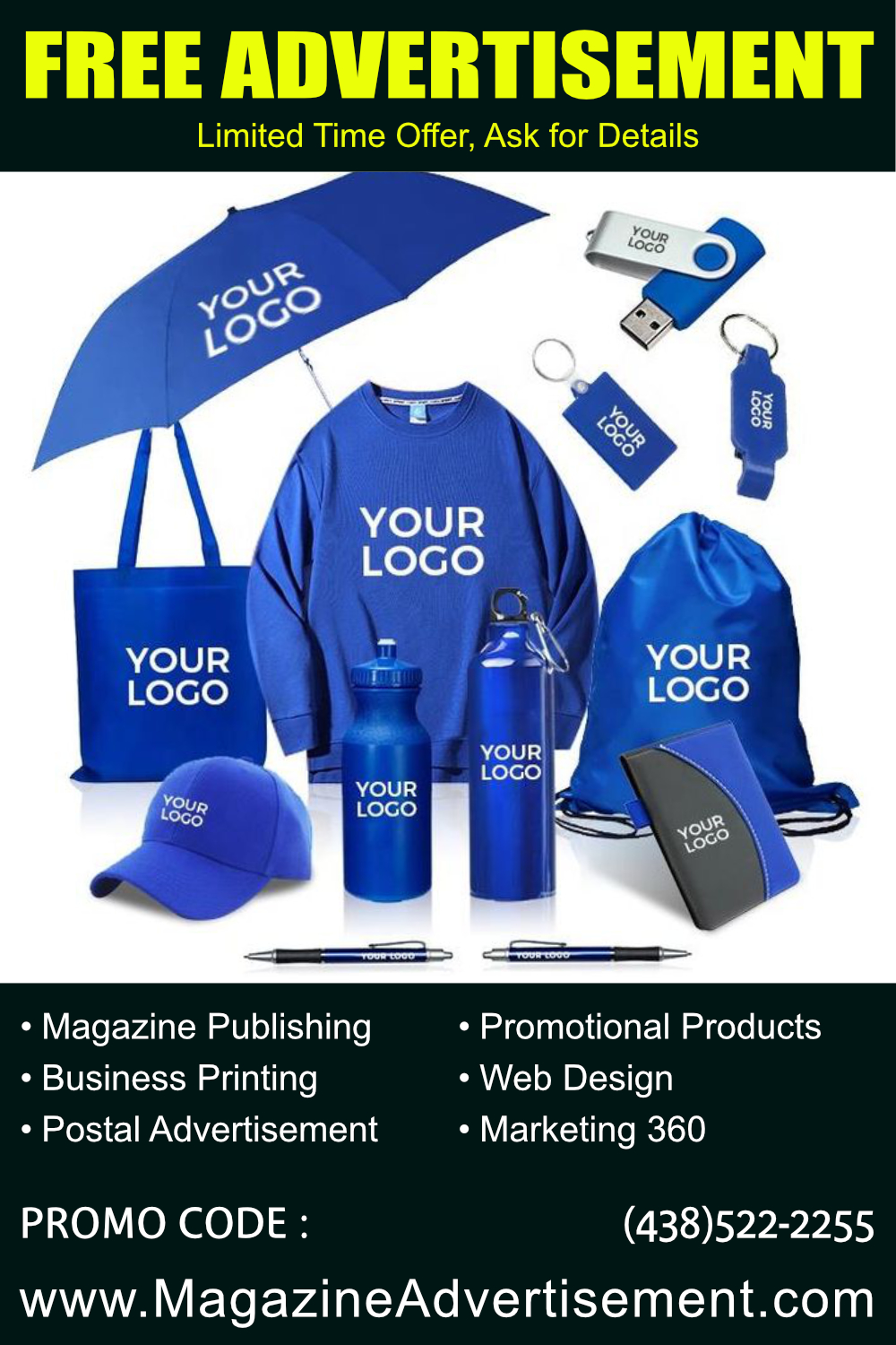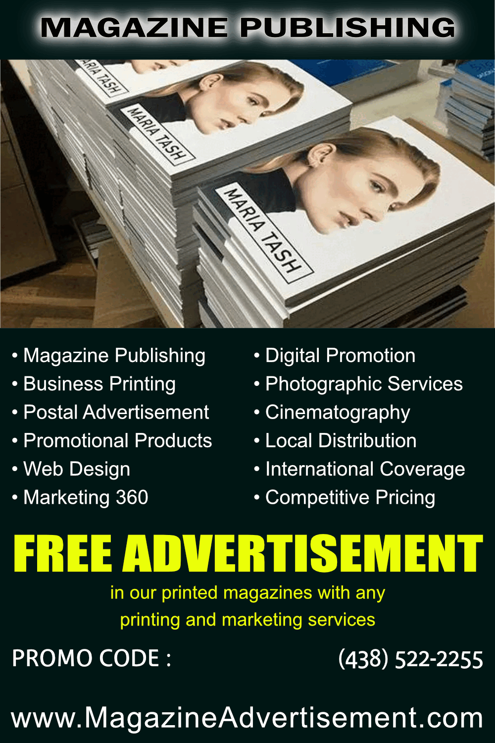 Thank you for your interest. You are entitled to a FREE Magazine Advertisement. Please, tell me what services you need ? We do all type marketing for your business. - Printed materials, - Promotional products, - Postal advertising - Webdesign and online promotion - Photography and Videography - All type of marketing physical and virtual To get your FREE Magazine advertisement use promo :